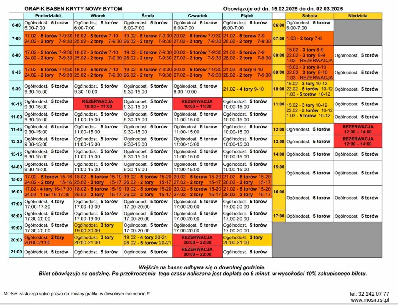 Przedstawiamy harmonogram wejść na basen kryty w Nowym Bytomiu.