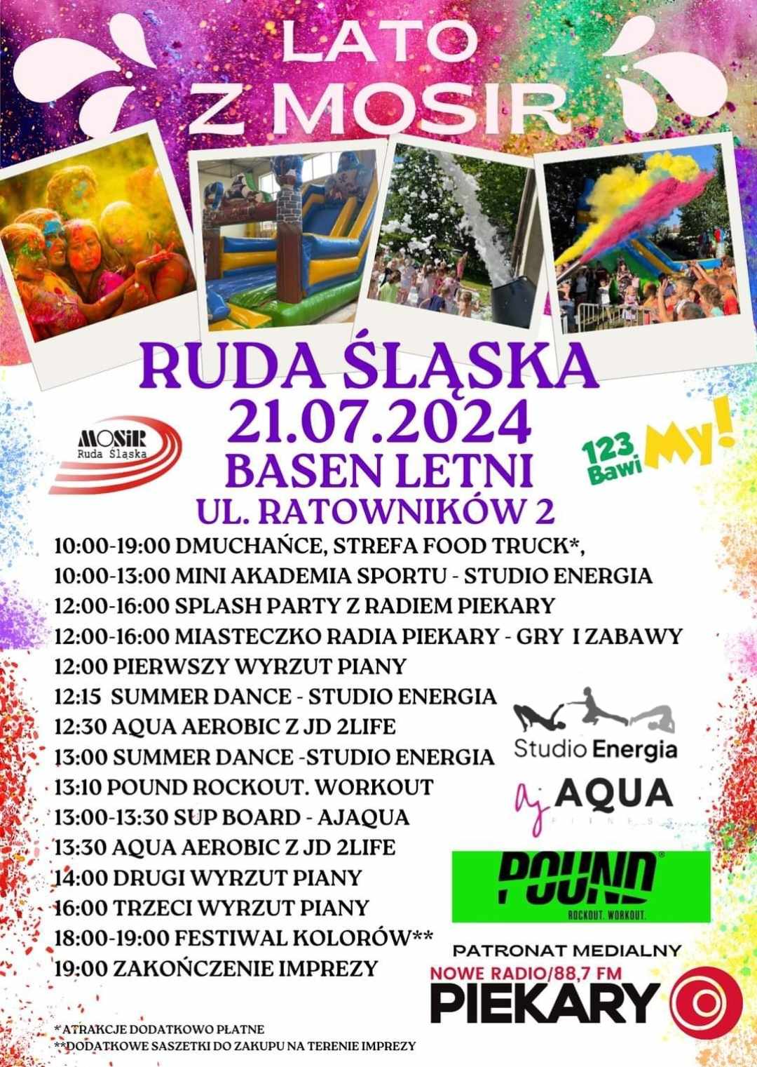 Dmuchańce, Strefa Food Truck, Splash Party z Radiem Piekary, Miasteczko Radia Piekary – gry i zabawy, Piana Party, Aqua Aerobik, Zumba, Festiwal Kolorów.