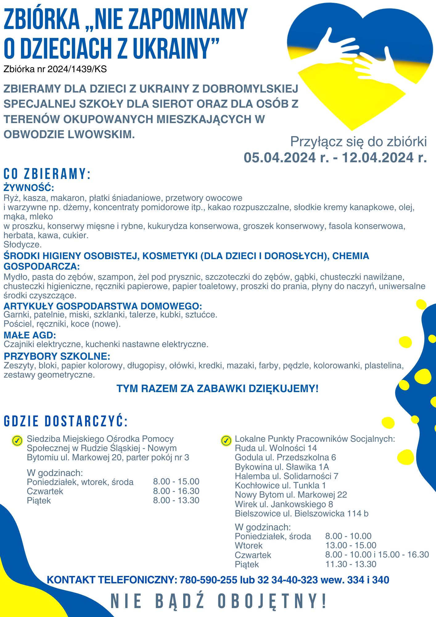 Dzisiaj ruszyła zbiórka „NIE ZAPOMINAMY O DZIECIACH Z UKRAINY”, która potrwa do 12.04.2024 r. Nie bądź obojętny. Przyłącz się do akcji.![]()